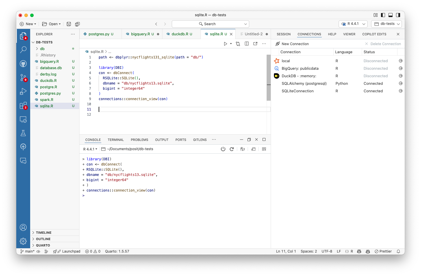 The Positron Connections Pane implements RStudio’s connections contract; this means that any package that works within RStudio’s Connections Pane should work within the Positron Connections Pane.